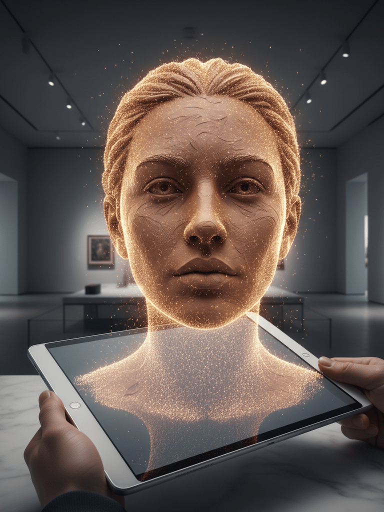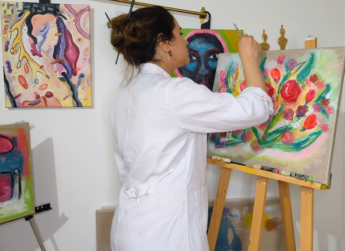 Issue d’un double parcours ingénieure en informatique et artiste, elle développe un art hybride mêlant techniques traditionnelles (huile, acrylique, dessin, modelage, gravure, sérigraphie) et dispositifs immersifs : réalité virtuelle (VR), réalité augmentée (AR) et intelligence artificielle (IA). Ses personnages, portraits, corps et marionnettes, prolongent leur présence dans le numérique, à la frontière du tableau, de la sculpture et de l’avatar.