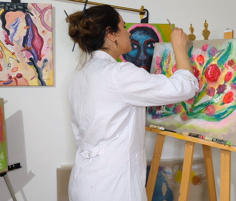 Salma Chaabane est une artiste multidisciplinaire franco-tunisienne, née à Sfax en Tunisie et installée en région parisienne. Son travail explore un dialogue constant entre abstraction et figuration, avec le corps et le portrait au cœur de sa recherche. À travers des couleurs vibrantes et contrastées, elle interroge le rapport à soi, le poids du regard des autres, ainsi que les tensions entre blessures intimes, rêverie et résilience.